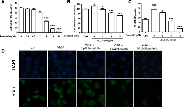 Figure 2: Effects of Ponatinib on viability and proliferation of HUVECs. (A) Effect of Ponatinib on basal viability of HUVECs. The cells were treated with Ponatinib at indicated concentrations or 0.1% DMSO (vehicle control) for 24 h. (B) Effect of Ponatinib on cell viability of VEGF-treated HUVECs. The cells were treated with VEGF (50 ng/mL) and Ponatinib (1, 3 and 10 μM) for 24 h. Cell viability was measured using the MTT assay. (C) Effect of Ponatinib on basal and VEGF-induced proliferation of HUVECs. The cells were exposed to VEGF (50 ng/mL) and Ponatinib (1, 3 and 10 μM) in the presence of BrdU for 24 h. After immunostaining, the BrdU-positive cells were counted and presented as the percentage of total cells. (D) Representative images of BrdU-positive cells with DAPI staining the nuclei. Values are presented as means ± SD (n = 3). #P < 0.05 and ###P < 0.005 vs. control group; *P < 0.05 and ***P < 0.005 vs. VEGF-treated group.