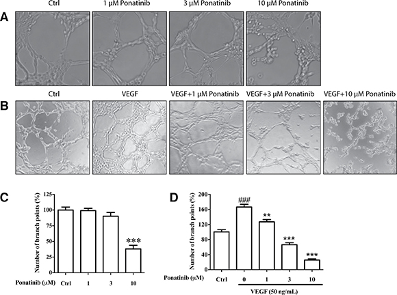 Figure 3: Effects of Ponatinib on basal and VEGF-induced tube formation in HUVECs. (A) Representative images of the cells treated with Ponatinib (1, 3 and 10 μM) alone or (B) in combination with VEGF (50 ng/mL) for 7–8 h. (C–D) The branch points were counted and presented as the percentage of the control group. Values are presented as means ± SD (n = 3). ###P < 0.005 vs. control group; **P < 0.01 and ***P < 0.005 vs. VEGF-treated group.