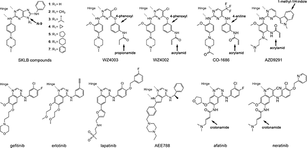 The epidermal growth factor receptor (EGFR) is an important therapeutic target for non-small-cell lung cancers (NSCLCs) [1–5]. The 4-anilinoquinazoline based reversible EGFR tyrosine kinase inhibitors (TKIs) gefitinib and erlotinib have been demonstrated effective in treating advanced NSCLC with EGFR mutants [4–8]. Unfortunately, in most of the cases, NSCLCs with EGFR activating mutations eventually develop resistance to these drugs, and in at least half of the relapsed cases the resistance is caused by a single secondary mutation in EGFR that leads to Thr to Met substitution at residue 790 (T790M), the gate-keeper residue [9–12].
