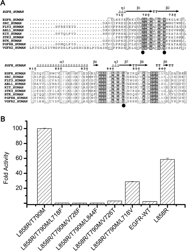 Figure 4: Impact of the hydrophobic clamp mutations on EGFR kinase activity. (A) Sequence alignment of EGFR and other important kinase enzymes discussed in this report. Residues of the hydrophobic clamp are denoted by ovals. (B) Comparison of the activity of the wild-type, L858R/T790M and L858R/T790M plus the hydrophobic clamp mutants. The fold activity of wild-type and mutant enzymes was calculated by determining the kcat for each protein with saturating ATP and 5mM ENAEYLRVA peptide substrate and dividing by the kcat for the wild-type enzyme. Error bars indicate the standard deviation of the triplicate measurements. The active enzyme concentrations of every kinase samples were determined by titrating the protein samples with the tight-binding inhibitor SKLB(5) (see Methods).
