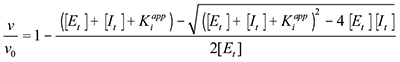 The raw data to calculate Ki were dose response curves done by fixing ATP concentration and changing inhibitor concentration in the assays. The Kiapp value was first determined using the Morrison Equation (for tight-binding substrate competitive inhibition):