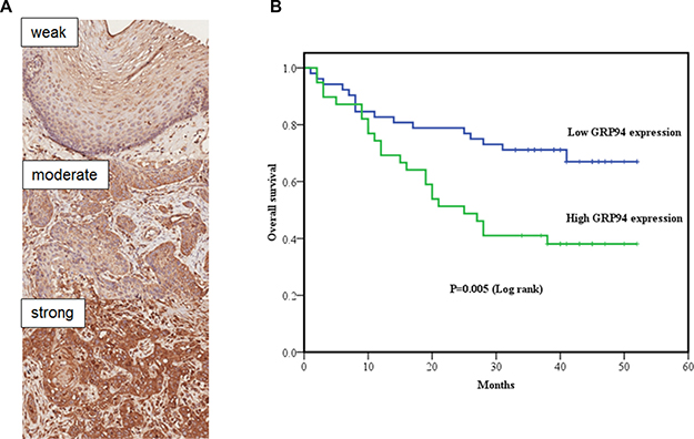 Figure 1: The clinical correlation of GRP94 in ESCC tissue arrays. (A) GRP94 expression in normal esophageal squamous epithelium and squamous cell carcinoma (SCC). Upper: Focal and weak GRP94 expression in normal esophageal squamous epithelium. Middle: Focal and moderate GRP94 expression in esophageal SCC. Bottom: Diffuse and strong GRP94 expression in esophageal SCC (Original magnification, X200). We divided the GRP94 expression scores (0-300) into 2 groups: low expression (0-200) and high expression (201-300). (B) Kaplan-Meier curve of overall survival in esophageal squamous cell carcinomas (ESCC) with low GRP94 and high GRP94 expression. Statistical significance between the two groups (P = 0.005).