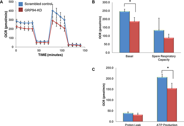 Intact cellular respiration was detected using the Seahorse XF24 Metabolic Flux Analyzer (Seahorse Bioscience, Chicopee, MA, USA). The cells were cultured in XF24-well microplates coated with CELL-TAK (BD Biosciences). Baseline measurements were recorded before the addition of 3 μM oligomycin, 1 μM carbonyl cyanide-4-(trifluoromethoxy)phenylhydrazone (FCCP), and 1 μM rotenone. The oxygen consumption rate (OCR), extracellular acidification rate (ECAR), an indicator of lactic acid production or glycolysis), spare respiratory capacity, and proton leakage were automatically calculated and recorded using Seahorse XF24 software. The percent change from the basal rate was calculated as the change in the rate divided by the average baseline rate.