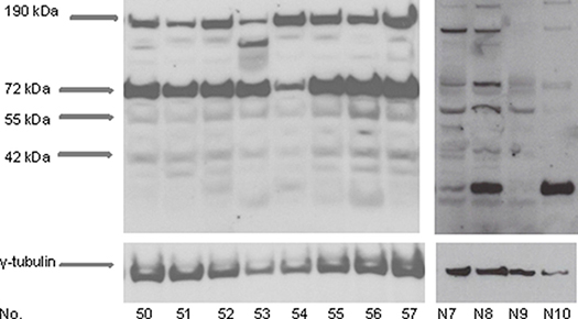 Figure 3: CXCR4 protein expression in vestibular schwannomas. Protein lysates were isolated from vestibular schwannoma samples and subjected to Western blotting analysis. Specific antibodies detected at least four CXCR4 isoforms of approximately 190 kDa, 72 kDa, 55 kDA, and 42 kDa (arrows), reflecting the structural heterogeneity of CXCR4 in tumors. γ-tubulin served as a loading control. Results are shown for 8 representative tumors (No. 50–57) of the total sample (n = 60) and for 4 representative nerves (No. N7–N10) for the control group (n = 10).