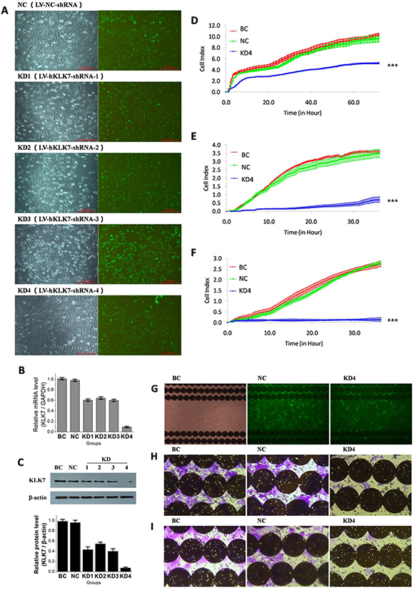 Figure 2: Infection of pancreatic cancer PANC-1 cells by lentivirus to knock down KLK7 expression, and compact of KLK7 gene silencing on PANC-1 cell proliferation, migration and invasion abilities identified by RTCA and microscopy. (A) observation of PANC-1 cells infected by lentivirus under microscopy. KD1, KD2, KD3, KD4 and NC are PANC-1 cells infected with LV-hKLK7-shRNA-1, -2, -3, -4 and LV-NC-shRNA respectively, BC are uninfected PANC-1 cells; (B) expression of KLK7 mRNA of PANC-1 cells in each group evaluated by real-time PCR, the relative expression of KLK7 mRNA in KD1-4 groups were decreased; (C) expression of KLK7 protein of PANC-1 cells in each group evaluated by Westernblot, the relative expression of KLK7 protein in KD1-4 groups were significantly decreased; (D) and (G) proliferation assay of PANC-1 cells in BC, NC and KD4 group. The proliferation ability of KD4 group was decreased compared to BC and NC groups; (E) and (H) migration assay of PANC-1 cells in BC, NC and KD4 group, migration ability of KD4 group was decreased compared to BC and NC groups; (F) and (I), matrigel invasion assay of PANC-1 cells in BC, NC and KD4 group, invasion ability of KD4 group was decreased compared to BC and NC groups,; the photographs were taken at the end of the RTCA assays. ***P < 0.001.