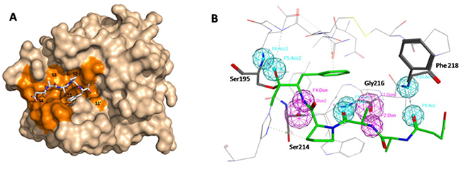 Figure 4: In silico screening preparation. (A) Druggable pocket identified by DoGSiteScorer using the crystal structure of KLK7 (2QXH). The druggable zone in the region of the active site involves the active site specificity sub-pockets S’1 and S1-S4 (in orange). The ligand Suc-Ala-Ala-Pro-Phe-chloromethylketone co-crystallized within the active site is shown in a stick representation. (B) pharmacophore model builded in MOE. Four hydrogen bonds formed between KLK7 and its ligand: P1-Phe N and Ser214 O, P3-Ala N and Gly216 O, P3-Ala O and Gly216 N, succinyl O and Phe218 N, P1-Phe O and Ser195 N.