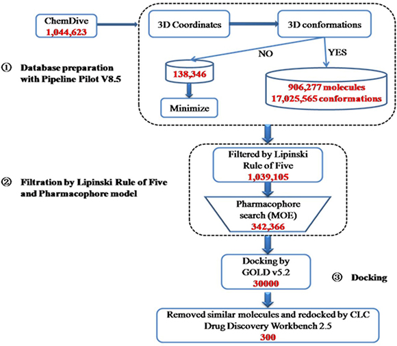 The 1,044,623 molecules in the ChemDiv database were prepared in Pipeline Pilot to generate 3-D conformations and minimized (Figure 5). Then, the obtained 17,163,911 conformations were filtered by Lipinski Rule of Five to remove the molecules without druggable properties. 95% of the conformations were removed as non druggable molecules and 1,039,105 conformations were kept for phamacophore search. After phamacophore filtration, 696,739 conformations were removed, as they do not form enough hydrogen bonds with KLK7 to ensure their interaction. The rest 342,366 conformations were kept for docking screening. In the docking step, GOLD was first used for flexible molecular docking, and the 342,366 conformations were ranked by their docking scores. The top 10% of the conformations with the highest score (30,000 conformations) were selected. After removing the conformations with the same molecular structure, the CLC Drug Discovery Workbench was used to re-evaluate these conformations. Finally, a total of 300 molecules (the top 300 of the conformations with the highest PLANTSPLP score) were kept for subsequent experimental screening.