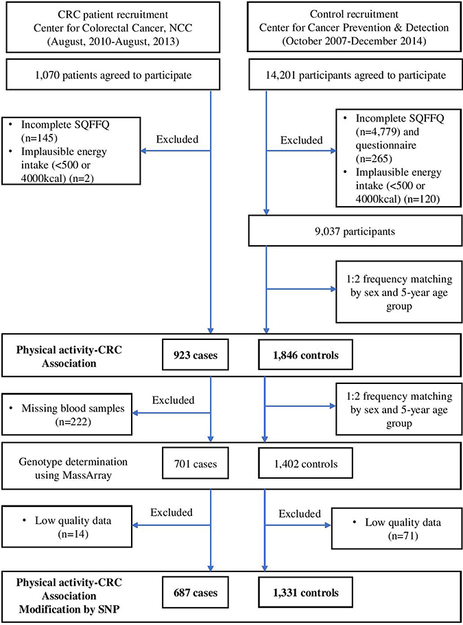Cases included patients who were newly diagnosed with CRC between August 2010 and August 2013 at the Center for Colorectal Cancer of the NCC in Korea. Of the 1,070 patients who agreed to participate in this study and provided informed consent, 145 were excluded due to incomplete semi-quantitative food frequency questionnaires (SQFFQ), and two patients were excluded due to implausible energy intakes (< 500 kcal/day or > 4000 kcal/day). Therefore, 923 patients were included in the analysis. The controls were selected from a group of participants who visited the Center of Cancer Prevention and Detection at the same hospital between October 2007 and December 2014 for a health check-up provided by the National Health Insurance Cooperation, which covers the entire Korean population. Of the 14,201 participants who agreed to participate in this study, 5,044 were excluded due to incomplete SQFFQ data, and 120 were excluded due to implausible energy intakes. Of the remaining 9,037 participants, random frequency matching of two controls per case was performed based on gender and 5-year age group. Therefore, 923 cases and 1,846 controls were selected for the analysis of the association between physical activity and CRC risk. Of these participants, 701 cases and 1,402 controls were selected, and their genotypes were determined at a 1:2 frequency and matched by sex and 5-year age group. Finally, 687 cases and 1,331 healthy controls with qualifying genotype data were selected for the analysis of the genetic association (Figure 1: a simplified flow chart describing the selection of study subjects). All participants provided written informed consent prior to participation. The study protocol was approved by the Institutional Review Board (IRB) of the NCC (IRB Nos. NCCNCS-10-350 and NCC2015-0202). All study protocols were performed according to the guidelines and regulations of the IRB of the NCC.