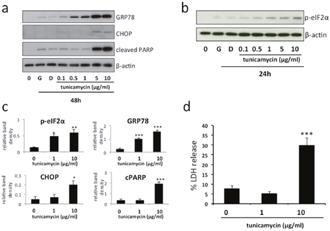Mild ER stress activates the unfolded protein response. However, if it is severe or prolonged ER stress results in cell death. To mimic these effects in vitro, we treated BeWo cells with increasing doses of tunicamycin, a compound routinely used to induce ER stress (Figure 1a). Immunoblotting revealed a dose-dependent upregulation of the chaperone protein GRP78 and phosphorylated eIF2α, signifying induction of an ER stress response, but only higher doses (5-10μg/ml) resulted in increased CHOP expression and PARP cleavage, signifying induction of more severe ER stress resulting in cell death (Figures 1a & 2a). Accordingly, for further experiments, tunicamycin concentrations of 1 and 10μg/ml were therefore selected to represent conditions of mild (significant upregulation of GRP78 & phosphorylated eIF2α but not CHOP & cleaved PARP, Figure 1c) and severe (significant upregulation of GRP78, phosphorylated eIF2α, CHOP & cleaved PARP, Figure 1c) ER stress respectively. Using these conditions we also observed significant increase of LDH release into the culture medium following severe ER stress induction, confirming the induction of cell death in response to severe, but not mild, ER stress (Figure 1d).