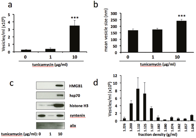 Figure 2: Severe ER stress stimulates the release of extracellular vesicles carrying danger-associated molecular pattern (DAMP) molecules. BeWo cells were treated with 1μg/ml or 10μg/ml tunicamycin, or DMSO control, for 48h. Extracellular vesicles were isolated from the culture medium by ultracentrifugation and analysed by NTA for quantity (a) and size (b). Equal volumes of EV pellet suspensions were analysed for expression of DAMPs HMGB1, hsp70 and histone H3, and exosome markers syntenin and alix by immunoblotting (c). (d) EV pellets from severely ER-stressed cells were resuspended in PBS (500μl) and overlaid onto 5-40% discontinuous iodixanol gradients. Ultracentrifugation was carried out at 150,000xg (maximum) for 18 h at 4°C. Fractions (12 x 1ml) were collected manually and EV concentrations were analysed by NTA. Results are represented as mean ± SEM for six (a-c) or three (d) separate experiments. ***p<0.001 compared with control (ANOVA).