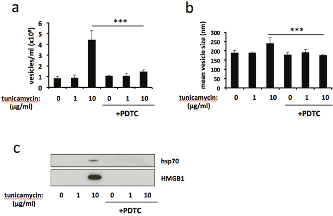 ER stress is associated with increased production of reactive oxygen species (ROS) and the development of oxidative stress [25]. Therefore we used the ROS-scavenging antioxidant pyrrolidine dithiocarbamate (PDTC) to examine the role of oxidative stress on ER stress-induced release of EVs. Treatment with PDTC significantly reduced the number of EVs released in response to severe ER stress (Figure 3a), and reversed the ER-stress induced increase in mean vesicle size (Figure 3b). Furthermore, release of vesicle-associated HMGB1 and hsp70 was completely abolished by PDTC treatment (Figure 3c). Taken together, these results show that antioxidant treatment attenuates ER stress-induced release of EVs.