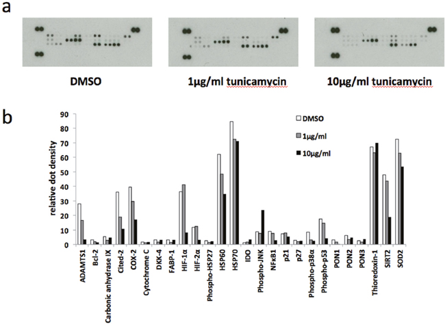 Figure 5: Human cell stress arrays. BeWo cells were treated with 1μg/ml or 10μg/ml tunicamycin, or DMSO control, for 48h. (a) Cell lysate samples containing equal amounts of protein were analysed on human cell stress arrays. (b) The blots shown in (A) were analysed by densitometric image analysis (Image J). The graph displays the proteins in the order on the dot blots, from top left to bottom right excluding the three positive control pairs of dots on the top left, top right and bottom left.