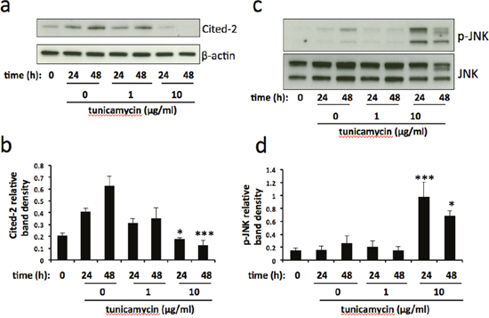 Figure 6: Cited-2 and phospho-JNK expression is altered in severe ER stress. BeWo cells were treated with 1μg/ml or 10μg/ml tunicamycin, or DMSO control, for 24h and 48h. At each time point cell lysates were made and analysed for the expression of Cited-2 (a) and phospho-JNK (c). Blots were analysed by densitometric image analysis (Image J), normalising to β-actin for Cited-2 (b) and total JNK for phospho-JNK (d). Results are represented as mean ± SEM for three separate experiments. *p<0.05, ***p<0.001 compared with control (ANOVA).
