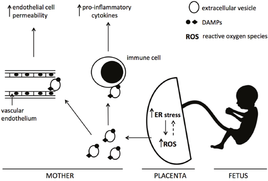 Figure 7: Proposed mechanism of action of ER stress-induced EV-associated DAMPs. Increased placental ER stress, via the production of reactive oxygen species, leads to the release of extracellular vesicles carrying DAMPs into the maternal circulation. These EV-associated DAMPs may interact with maternal endothelial and immune cells, resulting in exacerbated endothelial cell permeability and pro-inflammatory cytokine production.