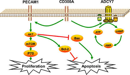 In this study, we investigated the role of PECAM1 and ADCY7 in AML. PECAM1 promoted proliferation and migration and inhibited the apoptosis, and ADCY7 participated in the regulation of proliferation and migration but not apoptosis of U937 cells (Figures 3A, 3B). Both PECAM1 and ADCY7 promote tumor progression through the AKT pathway, showing the same molecular mechanism as CD300A (Figure 5). Furthermore, CD300A knockdown inhibited PECAM1 and ADCY7 expression in U937 cells, implying a potential pathway of CD300A in AML cells. As cell surface proteins, CD300A has been proved to regulate AKT downstream signaling pathway. According to those results, we predicted that CD300A targeted PECAM1 and ADCY7, which activated the AKT pathway and then promoted the proliferation in U937 cells. However, it is interesting to note that CD300A inhibits the apoptosis through PECAM1 but not ADCY7 in U937 cells, implying the unknown mechanisms by which CD300A promotes tumor progression. In briefly, CD300A may contribute to tumor proliferation and apoptosis by upregulating PECAM1 and ADCY7, in addition to recruiting PTP in AML cells (Figure 6). In conclusion-we, for the first time, confirme that CD300A promotes cell proliferation and inhibits apoptosis of human AML by increasing PECAM1 and ADCY7 expression and AKT/mTOR signaling pathway activity. The results of this investigation show that CD300A was a potential therapeutic target for AML and requires further clinical trials to validate.