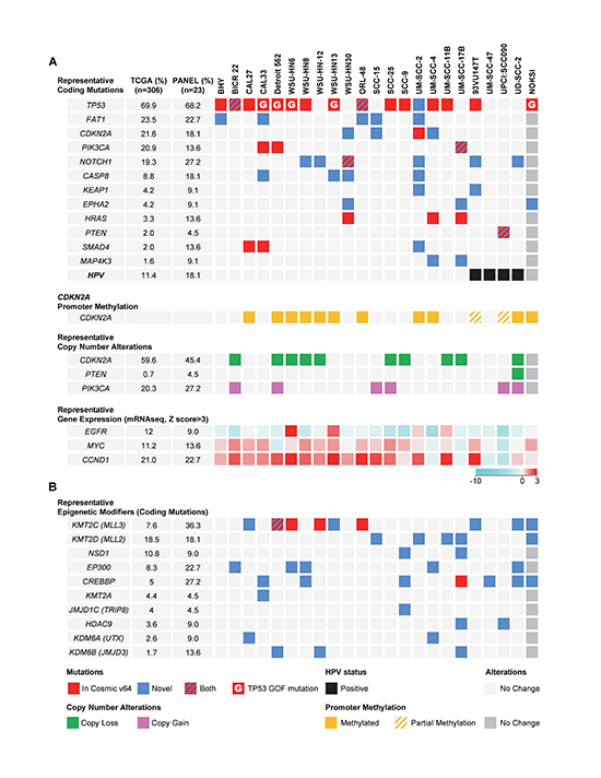 Figure 1. The most frequent alterations in representative HNSCC-derived cells. (A) Top panel, graphical matrix representation of the individual mutations in 22 HNSCC cells and a normal spontaneously immortalized oral keratinocyte line (NOKSI, dark grey to denote the exclusion from the OPC-22 panel). Individual genes are represented in rows and cell lines in columns. In some cases more than one mutation per gene is present. For a comprehensive list see Supplemental Data File 1. The HPV status of each HNSCC-derived cell is represented in the bottom row. Second panel, PCR based promoter methylation analysis of the CDKN2A gene. Third panel, representative per-gene copy number variations as derived from comparison of each cell line to a computed pseudo-normal. Fourth panel, representative gene expression levels as determined by RNAseq data. Color code represents a log2 transformed fold expression normalized to the median of all samples. (B) Mutations in genes encoding histone modifying enzymes. Red square, mutation described in the COSMIC v64 database. Blue square, novel mutation. Red/Blue square, two or more mutations in a gene, one being novel and the other present on the COSMIC v64 database. Red square with inlay G, TP53 mutation present in the COSMIC v64 database defined as Gain-Of-Function. Green square, Gene copy loss, representing both hetero and homozygous deletions. Pink square, Gene copy gain, representing both copy gain and gene amplification. Black square, HPV status. Yellow square, CDKN2A promoter region methylation, no unmethylated product was detected. Yellow/Gray, CDKN2A promoter methylation analysis detected both methylated and unmethylated products. Light and dark grey squares, no change.