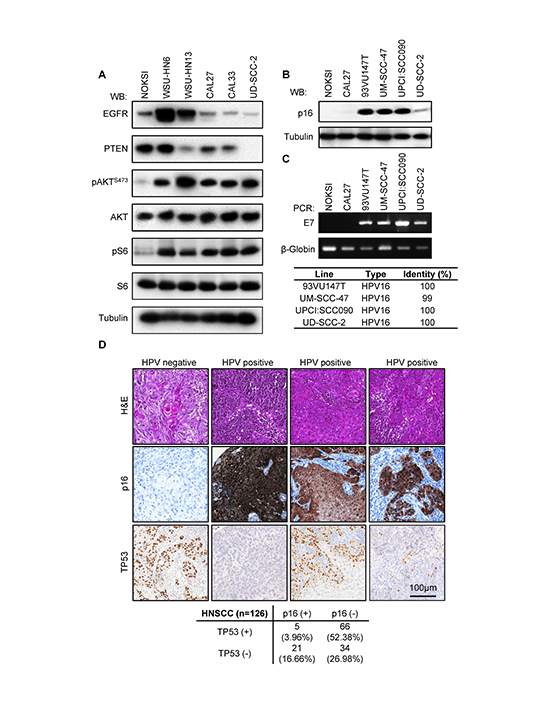 Figure 2. Exome sequencing data validation. (A) Biochemical characterization of alterations in PI3K-mTOR predicted by whole exome and RNAseq data for representative cell lines. Exponentially growing cultures were serum starved overnight and then lysed. A representative Western blot is shown for each indicated protein and phospho-protein. (B) Analysis of CDKN2A (p16) levels in HPV+ cell lines. (C) Upper panel, status of HPV infection by LCR-E7 PCR. HPV type identities were determined by Sanger sequencing of the LCR-E7 PCR amplicons. (D) A representative example of a cohort of 126 HNSCC tumors for which HPV status and TP53 mutation was evaluated as judged by immunohistochemical staining. A proportion of HPV+ (p16+) cases displays TP53 immunoreactivity, indicating the accumulation of TP53 mutant forms. TP53 staining in HPV+ samples varied in proportion and intensity. A quantification of the results of this study is presented in the lower panel.