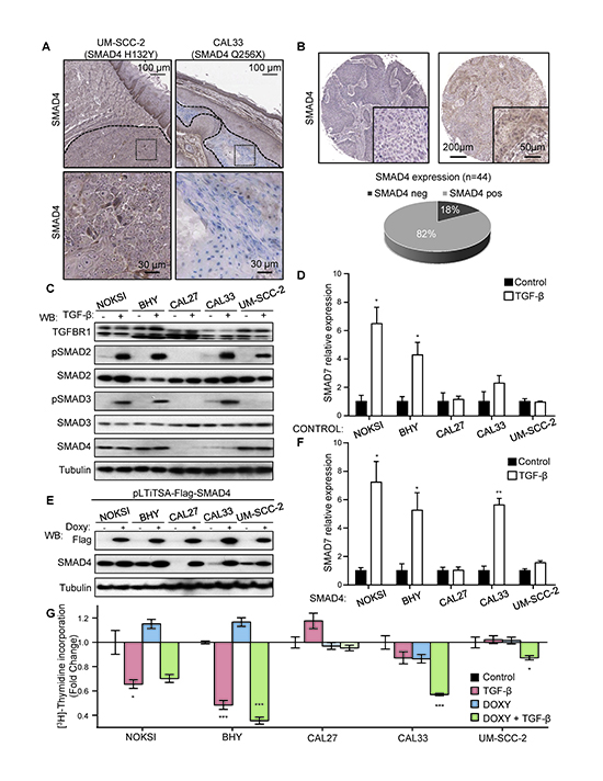 Finally, we asked whether impaired TGF-β provided any proliferative advantage in these cell lines. We conducted a cell proliferation assay in these engineered cell lines (Figure 3G) and observed that TGF-β treatment decreases the proliferation of both NOKSI and BHY cells. This antiproliferative response was absent in cells where TGF-signaling was defective (CAL27, CAL33 and UM-SCC-2). Interestingly, when SMAD4 expression was restored via induction with doxycycline, CAL33 showed a significant reduction in proliferation in response to TGF-β, while CAL27 and UM-SCC-2 remained refractory, mirroring the induction of SMAD7 expression changes observed in Figure 3F. We therefore concluded that the role of TGF-β signaling in HNSCC is antiproliferative, in agreement with previous reports [41], and that this response is dependent on proper R-SMAD and co-SMAD signaling leading to productive TGF-β gene expression regulation.