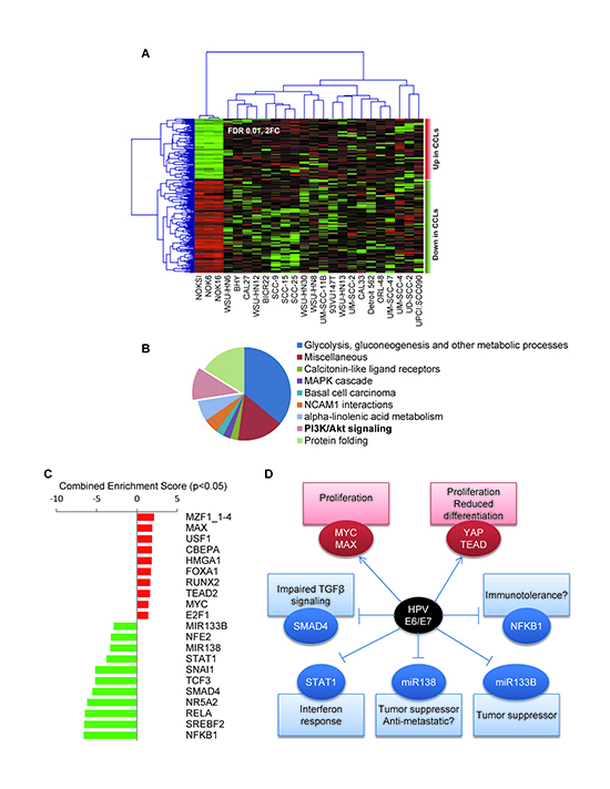 Figure 4. Gene expression analysis of the OPC-22 panel. (A) Supervised clustering analysis of the OPC-22 HNSCC lines on differentially expressed genes (FDR<0.01, Fold change ≥2) when comparing HNSSC lines to normal. Two additional normal cells lines (NOK6 and NOK16) represent two additional independent isolates from the same donor and were included in this analysis for statistical purposes. UM-SCC-17B was removed from the analysis due to outlier expression profile. (B) Functional enrichment analysis on biological processes on differentially expressed genes using the ClueGO tool. (C) Genes differentially expressed between HPV+ and HPV- groups (Moderated T-test, p<0.05, fold change >±2) were analyzed by the Enrichr tool against the TRANSFAC and JASPAR position weight matrices (PWMs) for predicted transcription binding sites in their respective promoter regions. The combined score is a positive value computed by taking the log of the p-value from the Fisher’s exact test and multiplying that by the z-score of the deviation from the expected rank. Enrichment scores derived from the downregulated gene list were given negative value for representation purposes. (D) Schematic representation of a hypothetical HPV E6/E7 interaction network leading to differential gene expression in the OPC-22 HPV+ cohort.
