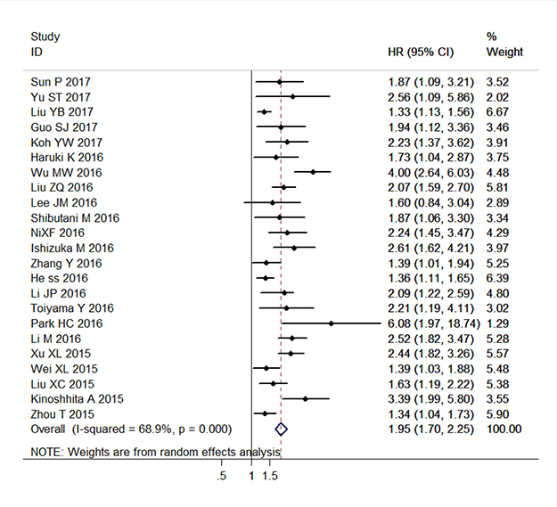 The combined analysis of 23 studies with 10067 patients showed that patients with elevated CAR were expected to suffer unfavorable OS (HR = 1.95, 95% CI: 1.70–2.25, P < 0.001, random effects; Figure 2). When stratified by cancer type, high CAR predicted poor OS for patients with PC (HR = 2.25, 95% CI: 1.52–3.34, P < 0.001, random effects), CRC (HR = 2.26, 95% CI: 1.71–2.99, P < 0.001, fixed effects), NPC (HR = 1.50, 95% CI: 1.29–1.74, P < 0.001, random effects), ESCC (HR = 1.84, 95% CI: 1.06–3.20, P = 0.030, random effects), GC (HR = 1.73, 95% CI: 1.31–2.29, P < 0.001, fixed effects), HCC (HR = 2.73, 95% CI: 2.07–3.60, P < 0.001, fixed effects), head and neck cancer (including LSCC and OSCC) (HR = 3.49, 95% CI: 1.78–6.85, P < 0.001, fixed effects), and other cancers (HR = 1.41, 95% CI: 1.24–1.60, P < 0.001, fixed effects). Similarly, when grouped based on study region, the prognostic role of elevated CAR in predicting shorter OS was obvious in studies originated from China (HR = 1.84, 95% CI: 1.57–2.17, P < 0.001, random effects), Japan (HR = 1.82, 95% CI: 1.60–1.85, P < 0.001, fixed effects), and Korea (HR = 2.39, 95% CI: 1.34–4.24, P = 0.003, random effects). Moreover, the significant association of high CAR and worse OS did not change regardless of the subgroup analyses of primary treatment, clinical stage, cut-off selection, sample size, and cut-off value (Table 1).