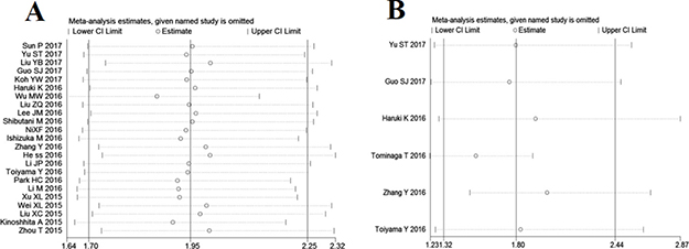 Figure 4: Effect of individual studies on pooled hazard ratios (HR) for the relationship between C-reactive protein/albumin ratio and prognosis of solid tumors. (A) Sensitivity analysis for overall survival. (B) Sensitivity analysis for disease-free survival.