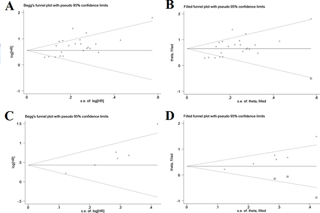 Figure 5: Funnel plots for assessment of potential publication bias in studies of C-reactive protein/albumin ratio and prognosis of solid tumors. (A) Funnel plot of publication bias for studies reporting overall survival. (B) Funnel plot adjusted with trim and fill method for studies reporting overall survival. (C) Funnel plot of publication bias for studies reporting disease-free survival. (D) Funnel plot adjusted with trim and fill method for studies reporting disease-free survival.