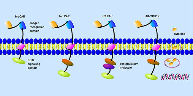 Figure 1: CAR-T-cell design. Chimeric antigen receptors (CARs) are composed of an extracellular domain, a transmembrane domain and an intracellular signaling domain. First generation CARs only have a CD3z signalling domain. By contrast, second generation CARs have a costimulatory signalling domain to enhance the signal function of the CD3z signalling domain. In third generation CARs, two costimulatory signalling domains are added to amplify anti-tumor effect of secondgeneration CARs. While in the fourth generation CARs (TRUCKs), cytokine genes are added.