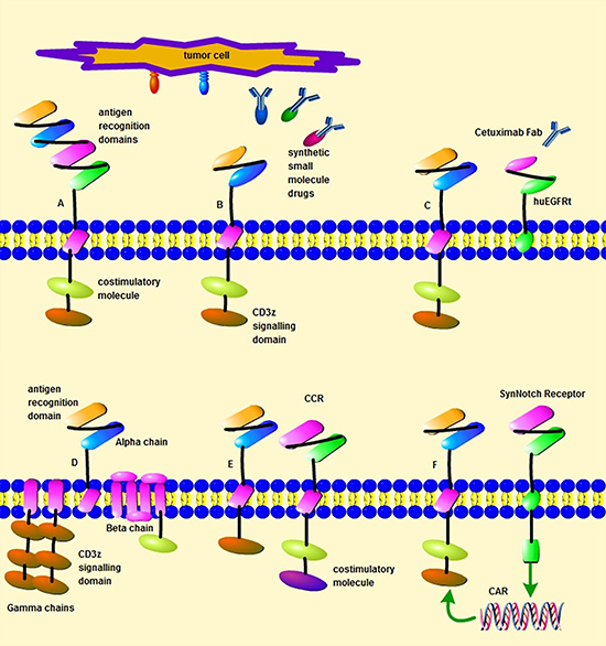 Figure 2: Different design strategies of CAR T cells. (A) A bi-specific CAR targeting two different antigens. (B) A CAR that target tumor antigens through synthetic small molecule drugs, such as the avidin-CAR, sCAR or UniCAR. (C) A CAR designed with huEGFRt. (D) The design of multi-chain CAR based on FcεRI receptor scaffold (E) A suboptimal CAR and a chimeric co-stimulatory receptor (CCR) expressed by one T cell. (F) The expression of a CAR induced by a synNotch receptor within one T cell.