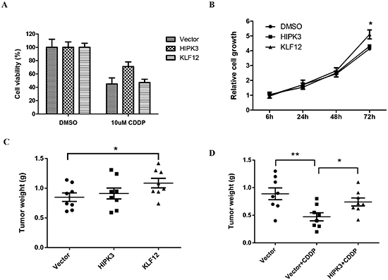 Figure 5: HIKP3 and KLF12 stimulate chemosensitivity and OS cell growth, respectively. (A) Overexpression of HIKP3 protected cells from death induced by CDDP treatment. KLF12 overexpression did not have this effect. MG63 cells were transfected with the indicated plasmid. After 24 hrs, cells were seeded into 96-well cell culture plates. The next day, cells were treated with DMSO or 10 µM CDDP for 48 hrs and cell viability was measured with a MTT assay. The data are presented as the mean ± SD from three independent experiments. (B) Overexpression of KLF12, but not HIKP3, stimulated cell growth. MG63 cells were transfected with the indicated plasmid. After 24 hrs, cells were seeded into 96-well cell culture plates and cell viability was measured at the indicated time using a MTT assay. The data are presented as the mean ± SD from three independent experiments. (C) In the MNNG/HOS xenograft model, tumor growth was increased by KLF12 overexpression, but not by HIPK3 overexpression. (D) HIPK3 overexpression induced resistance to CDDP in the MNNG/HOS xenograft model.