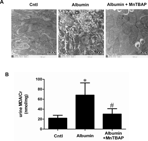 Eleven days of albumin overload in mice resulted in a severe structural disruption of the mitochondria in renal tubular cells as determined by TEM (Figure 1A). Meanwhile, the oxidative stress marker of MDA in urine was elevated by albumin overload (Figure 1B). Strikingly, all these abnormalities were reversed by a mitochondrial SOD2 mimic MnTBAP (Figure 1A and 1B).