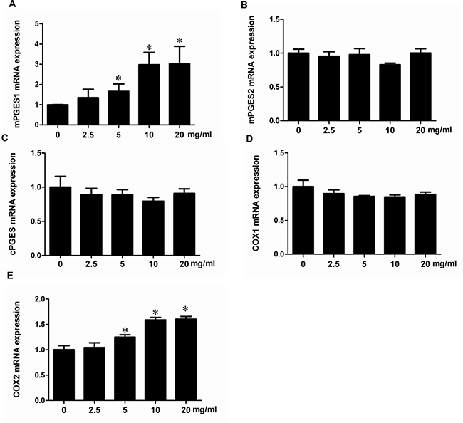 Figure 4: Albumin upregulated the mRNA expressions of COX-2 and mPGES-1 in a dose-dependent manner in mPTCs. (A) qRT-PCR analysis of mPGES-1. (B) qRT-PCR analysis of mPGES-2. (C) qRT- PCR analysis of cPGES. (D) qRT-PCR analysis of COX-1. (E) qRT-PCR analysis of COX-2. The values represent means ± SD (n = 6). *P < 0.01 vs. control.