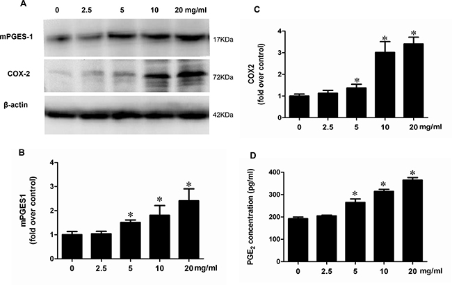 Figure 5: Albumin stimulated the protein expressions of COX-2 and mPGES-1 and PGE2 release in a dose-dependent manner in mPTCs. (A) Western blots of mPGES-1, COX-2, and β-actin. (B) Densitometric analysis of mPGES-1. (C) Densitometric analysis of COX-2. (D) PGE2 concentration in medium. The values represent means ± SD (n = 6).