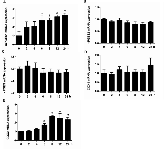Figure 6: Albumin upregulated the mRNA expressions of COX-2 and mPGES-1 in a time-dependent manner in mPTCs. (A) qRT-PCR analysis of mPGES-1. (B) qRT-PCR analysis of mPGES-2. (C) qRT- PCR analysis of cPGES. (D) qRT-PCR analysis of COX-1. (E) qRT-PCR analysis of COX-2. The values represent means ± SD (n = 6). *P < 0.01 vs. control.