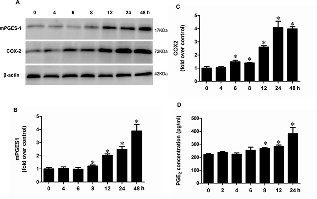 Figure 7: Albumin stimulated the protein expressions of COX-2 and mPGES-1 and PGE2 release in a time-dependent manner in mPTCs. (A) Western blots of mPGES-1, COX-2, and β-actin. (B) Densitometric analysis of mPGES-1. (C) Densitometric analysis of COX-2. (D) PGE2 concentration in medium. The values represent means ± SD (n = 6). *P < 0.01 vs. control.