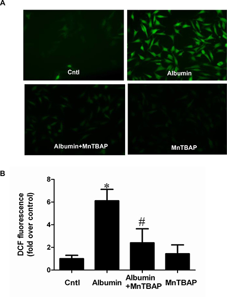 Figure 8: MnTBAP treatment suppressed albumin-induced ROS production in mPTCs. (A) Representative image of DCF fluorescence. (B) Quantitative analysis of ROS production by DCF fluorescence. The values represent means ± SD (n = 6). *P < 0.01 vs. control. #P < 0.01 vs. albumin group.