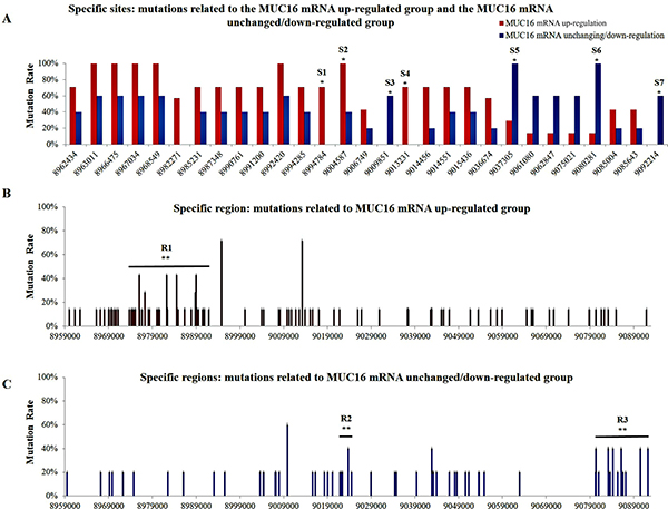 Figure 1: Distribution of mutations within the MUC16 gene. (A) Mutations at specific sites in the MUC16 up-regulated and unchanged/down-regulated groups. (B) More mutations occurred in region 1 (R1) in the MUC16 up-regulated group. (C) Mutations occurring at region 2 (R2) and region 3 (R3) in the MUC16 unchanged/down-regulated group. Statistical significance was calculated using Fisher’s exact test (*p < 0.05, **p < 0.01).