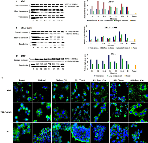 Figure 3: MUC16 protein expression in cultured cells after MUC16 gene editing. (A–C) Western blot analysis of MUC16 protein levels in the three cell lines after transfection alone (Transfection), transfection plus short-term cisplatin treatment (Short cis treatment), and transfection plus long-term cisplatin treatment (Long cis treatment). Compared to those of the parent cell lines (P and Parent), elevated protein levels were observed in cultured cells after MUC16 gene editing. The MUC16 protein band corresponding to 180 kDa (left) was used for semi-quantitative analysis. α-Tubulin (50 kDa) was used as the internal control and reference for semi-quantitative analysis. (D) MUC16 protein was stained in the three cell lines using immunofluorescent antibodies. The staining signal was slightly increased at the membranes and in the cytoplasm of A549 and 293T cells after treatment compared to that of the parent cells. Note: the staining was obviously enhanced at the membranes of EPLC-32M1 cells after treatment. Parent: parent cells (wild types); Trans: transfection alone; Cis: transfection plus long-term cisplatin treatment. S1, S2, S2-1, S4, S5, S5-1, and R1: mutation systems used in this study.