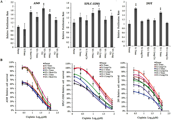 Figure 4: Cellular proliferation and resistance to cisplatin in cultured cells after MUC16 gene editing. (A) The bar graphs demonstrate a significant increase in the proliferation rate of cultured cells after treatment compared to that of the respective parent cells (Student’s t-test; *p < 0.05, **p < 0.01). (B) Parent cells, transfected cells, and cisplatin-resistant cell populations were incubated with different concentrations of cisplatin, and then cell viability was determined. The cell-survival curves demonstrate a significant increase in cisplatin resistance in the cultured cells after treatment compared to that of the respective parent cells. Parent: parent cells (wild types); S1, S2-1, and S5-1: mutation systems used in this study; Trans: transfection alone; Short Cis: transfection plus short-term cisplatin treatment; Long Cis: transfection plus long-term cisplatin treatment.