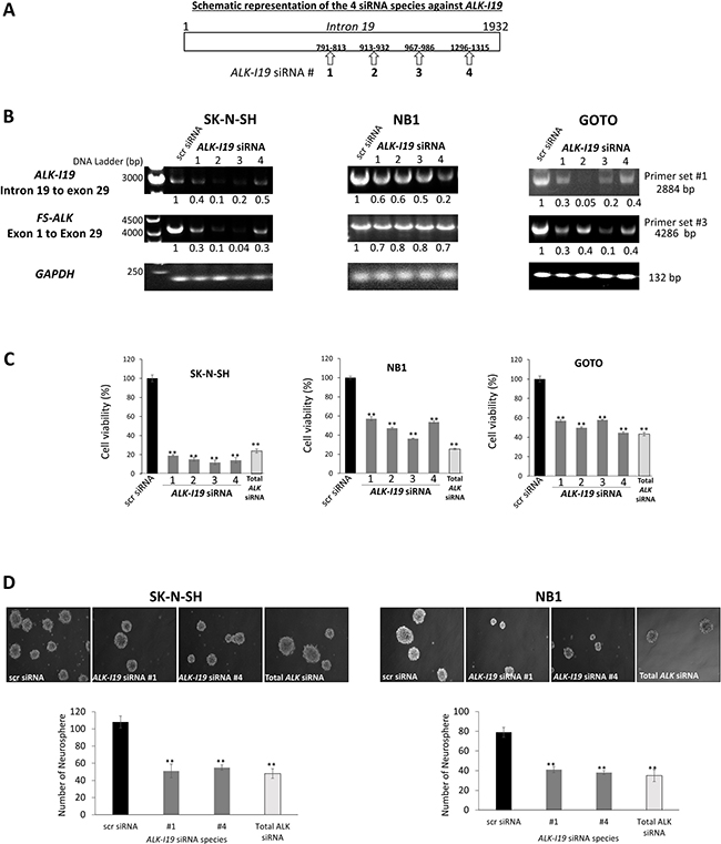 Figure 2: siRNA knockdown of ALK-I19 decreases the expression of FS-ALK, cell growth and neurosphere formation in NB cells. (A) Schematic representation of the four ALK-I19 siRNAs used. (B) The expression levels of ALK-I19 (primer set #1) and FS-ALK (primer set #3) were reduced 48 hours following siRNA knockdown of ALK-I19 in three NB cell lines. GAPDH was used as the loading control for the RT-PCR assay. The densitometry value of each band was normalized to that observed with scrambled (scr) siRNA. (C) siRNA knockdown of ALK-I19 significantly decreased cell growth at 72 hours, as assessed by MTS assay. Data is presented as mean ± standard deviation and statistical significance was determined using Student’s t test. The p value for all runs is < 0.01. Triplicate experiments were performed. (D) siRNA knockdown of ALK-I19 significantly decreased neurosphere formation, measured at 2 weeks after the siRNA knockdown. Data is presented as mean ± standard deviation and statistical significance was determined using Student’s t test. The p value for all runs is < 0.01. Triplicate experiments were performed.