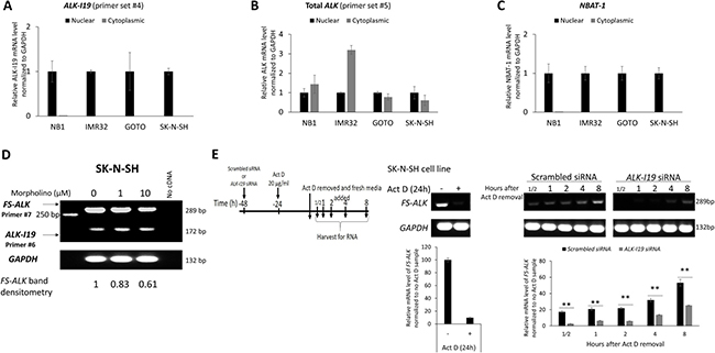 Figure 3: ALK-I19 is the precursor of FS-ALK. (A–C) Measurement of ALK-I19 in the nuclear and cytoplasmic fractions of NB cells showed that ALK-I19 is expressed only the nucleus. In contrast, total ALK was found in both the nuclear and cytoplasmic fractions. NBAT-1 was used as the control for the nuclear/cytoplasmic fractionation efficiency [47]. (D) Inhibition of the splicing between exon 19 and intron of ALK 19 using morpholino appreciably decreased the level of FS-ALK at 48 hours. The densitometry value of FS-ALK bands was normalized to the cell sample not treated with morpholino. The level of ALK-I19 was not dramatically changed. (E) SK-N-SH cells were first treated with either scrambled siRNA or ALK-I19 siRNA for 24 hours. Subsequently, these cells were treated with 20 μg/ml Actinomycin D (Act D) for another 24 hours. After washing, cells were cultured in fresh growth media and RNA was harvested at different time points. This experiment was performed in the presence of either scrambled siRNA or ALK-I19 siRNA. Cells treated with scrambled siRNA followed by actinomycin D expressed a substantial higher level of FS-ALK than cells treated with ALK-I19 siRNA followed by actinomycin D. The densitometry value of each band was normalized to the cell sample receiving scrambled siRNA and no actinomycin D. Data is presented as mean ± standard deviation and the statistical significance was assessed using Student’s t test.