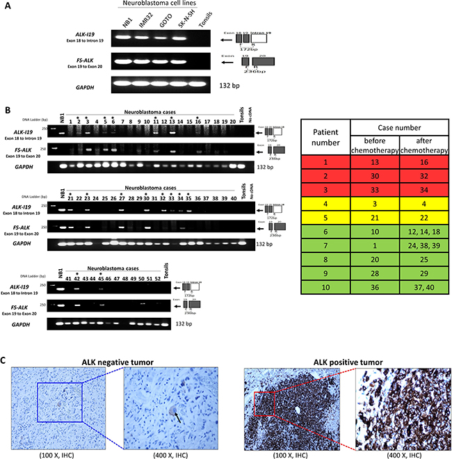 Figure 4: The expression of ALK-I19 and FS-ALK in formalin-fixed/paraffin-embedded (FFPE) NB tumors. (A) RT-PCR using primer set #6 (ALK-I19) and #9 (FS-ALK) was used to study 4 NB cell lines and a reactive tonsil. (B) RT-PCR using primer set #6 and #9 was used to detect the expression of ALK-I19 and FS-ALK in 52 FFPE tumors derived from 37 patients. Asterisks indicate cases that were labeled ALK-I19 positive, in which definitive ALK-I19 bands could be identified. GAPDH was used as the loading control. The table on the right panel summarizes the 10 patients for whom pre- and post-chemotherapy tumor samples were obtained. Patient #1-5 had ALK-I19 positive tumor at diagnosis. Patient #1-3 (highlighted in red) had ALK-I19 positive tumors after chemotherapy whereas patient #4 and #5 (highlighted in yellow) had residual tumors that were ALK-I19 negative. Patient #6-10 (highlighted in green) had ALK-I19 negative tumors at diagnosis, and the residual tumors of all of these patients remained to be ALK-I19 negative. (C) Immunohistochemical (IHC) detection of ALK showed heterogeneous staining intensity in NB tumors. On the left panel in which an ALK-negative tumor is illustrated, ALK immunostaining was found only in the ganglion-like cells (black arrow) and the intensity was weak. On the right panel in which an ALK-positive tumor is illustrated, intense ALK immunostaining was found in large tumorous areas of undifferentiated histology.