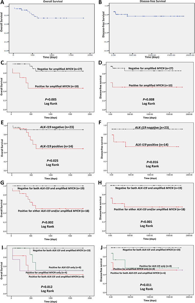 Figure 5: The prognostic significance of ALK-I19 and MYCN amplification in 37 NB patients based on the overall survival (left panel) and the disease free survival (right panel). Kaplan–Meier survival is illustrated for the following: (A and B) the entire cohort; (C and D) patients with MYCN amplification versus those without; (E and F) patients with ALK-I19 versus those without; (G and H) patients with ALK-I19 and/or MYCN amplification versus those negative for both genetic markers; (I and J) patients with ALK-I19 versus patients with MYCN amplification versus patients with both genetic markers versus those negative for both genetic markers.