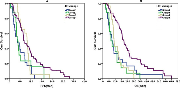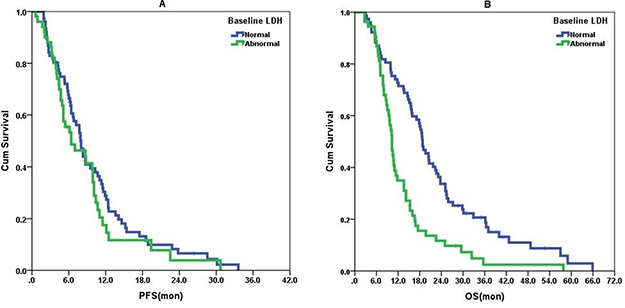 Decreases in LDH may reflect cessation of tumor growth, while increases are associated with tumor progression [35]. In this study, most of the 28 patients with post-treatment LDH that decreased to normal after chemotherapy, had a good response to chemotherapy (PR or CR), and ORR was significantly higher than that in patients with abnormal post-treatment serum LDH higher than baseline. This suggested that LDH changes after chemotherapy reflect tumor regression. However, no significant advantages were found for patients with post-treatment LDH that did not decline to normal and patients with both normal baseline and post-treatment LDH. Likely tumor regression occurred with the rapid and dramatic fall in LDH and this might explain why patients whose post-treatment LDH decreased to normal had longer PFS.