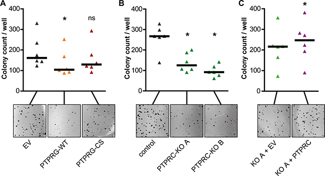 Figure 4: PTPRG attenuates and PTPRC promotes BCR-ABL1 dependent cell transformation. K562 overexpressing PTPRG-WT or PTPRG-CS (A), PTPRC knockout clones A and B (B), or PTPRC re-expressing cells (KO A + PTPRC) (C) were analyzed for colony formation in methylcellulose. Representative images of colonies are shown. Each triangle represents colony count per well (mean of duplicates of an individual experiment). Black bars represent the median of n = 6 independent experiments. ns (not significant) if p > 0.05; * if p < 0.05. Comparison with the respective control was performed with the Wilcoxon matched pairs test.
