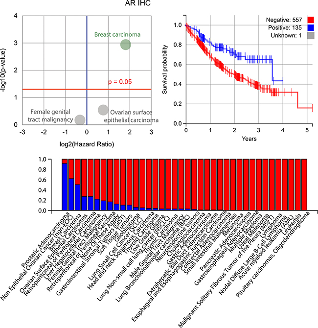 Figure 7: Plots for the androgen receptor (AR) biomarker, which was indicated to be significantly prognostic for patient outcomes along with ER and PR. Upper left: AR is highly prognostic for breast cancer, as shown in this volcano plot. Upper right: a Kaplan-Meier plot for PR where patients positive for AR have an improved outcome, although this narrows over the long-term. Below: the percentage in each cohort that have a positive AR biomarker result (blue is positive).