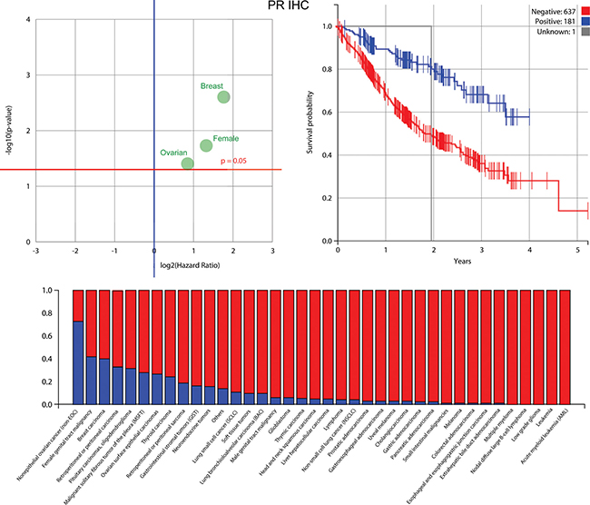 Figure 6: Information about the progesterone receptor (PR) biomarker, which was found to be most prognostic for patient outcomes along with ER and AR. Upper left: PR is highly prognostic for ovarian surface epithelial cancer, breast cancer and female genital tract malignancy. Upper right: a Kaplan-Meier plot for PR that shows that patients with a positive biomarker result have an improved outcome. Below: the percentage in each cohort that have a positive PR biomarker result (blue is positive).