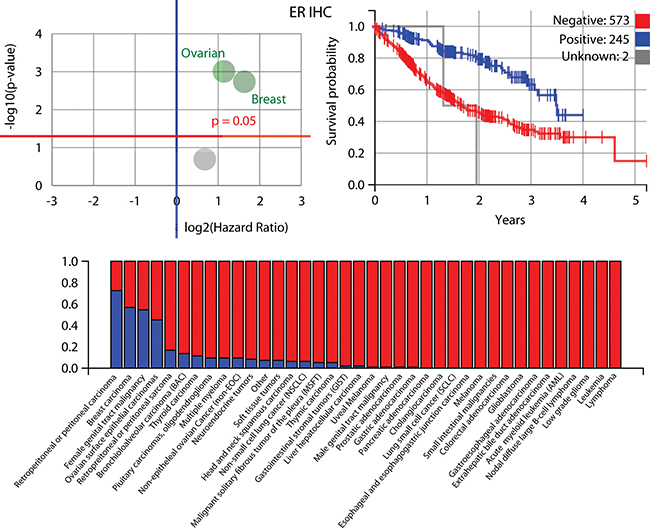 Figure 5: Further information about the estrogen receptor (ER) IHC biomarker, which was identified to be most prognostic for patient outcomes along with PR and AR. Upper left: ER is highly prognostic for ovarian surface epithelial cancer and breast cancer, as shown in this volcano plot. Upper right: a Kaplan-Meier plot for ER, i.e. those patients with a positive biomarker result have an improved outcome compared to those that do not, although this lessens in the long-term. Below: positive ratio for the ER IHC biomarker in different cancer cohorts within the Caris data i.e. the percentage in each cohort that have a positive biomarker result, when measuring protein expression above a predefined threshold (blue is positive).