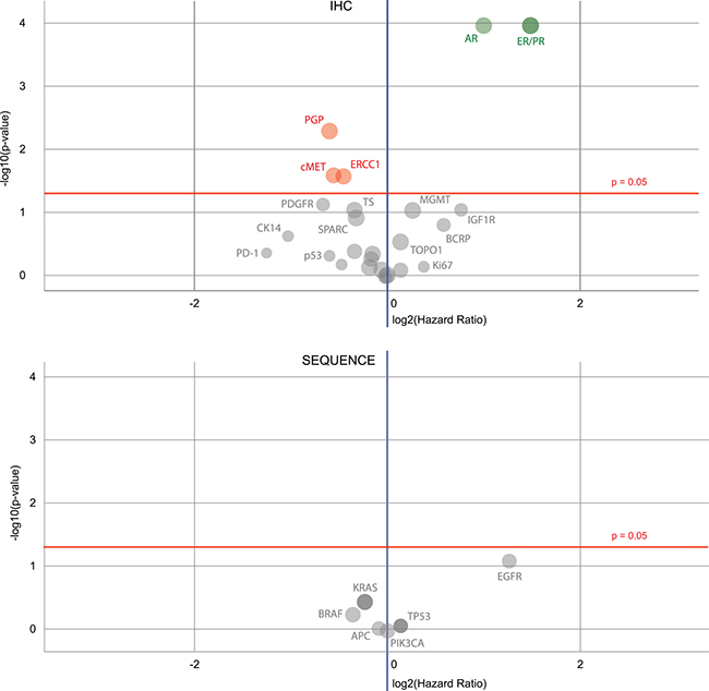 Figure 4: Volcano plots of biomarkers’ prognostic values. In the plot shown above, several IHC biomarkers are of significance – ER, PR, AR (all are on the top right in green), also PGP, cMET and ERCC1 (in red) – and in the plot shown below, the EGFR sequencing marker stands out from the others, but is not statistically significant. In both plots, green dots indicate when the hazard rate of a positive biomarker result is significantly lower than that of a negative biomarker result, whereas a red dot is for when the hazard rate of a positive biomarker result is significantly higher than that of a negative biomarker result; gray dots denote when the difference between a positive and negative biomarker result is not significant.