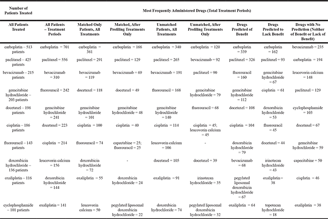 In the matched group 34% of patients died compared to 47% of the unmatched group of patients. Figure 3 shows a Kaplan-Meier curve of overall survival for patients treated only with therapies predicted to be beneficial, compared to those of the unmatched treatment group. Figure 3 also shows biomarker differences between the matched and unmatched groups, and summaries of survival, treatment and sample information. Table 4 shows a summary of the differences in survival between some of the larger cancer categories available in the data analyzed here, along with biomarkers and drugs given most often for those cancer subsets.