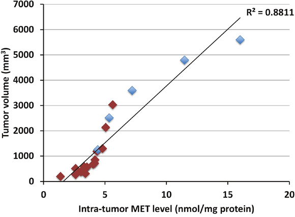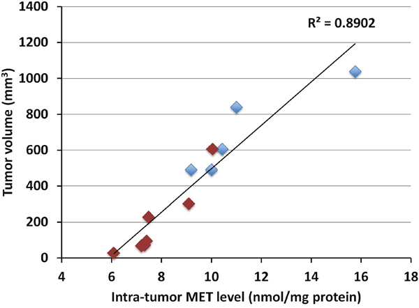This is the first report that intra-tumor MET levels highly correlated with tumor volume. These results demonstrate that MET restriction, using rMETase, has promising clinical potential.